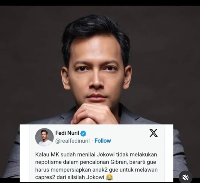 “Jika Mahkamah Konstitusi memutuskan Jokowi tidak melakukan nepotisme dengan mencalonkan diri sebagai Gibran, berarti saya harus mempersiapkan anak-anak saya untuk melawan calon presiden dari penerus Jokowi,” tulis Fedi Nuril.