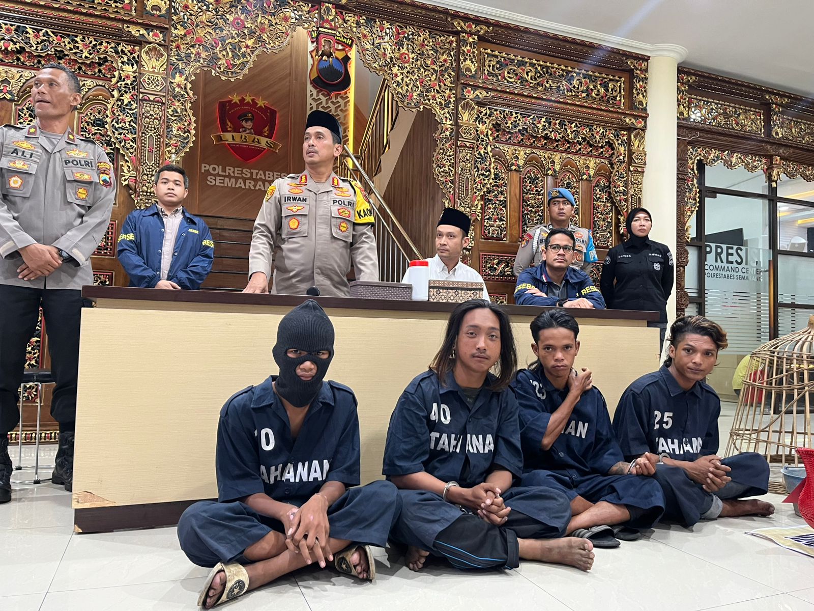 PANDUGA.ID, SEMARANG – Empat pemuda pekerja bangunan ditangkap oleh polisi setelah terlibat dalam kasus penganiayaan di Jalan Potrosari, Kelurahan Srondol Kulon, Banyumanik, Kota Semarang. Keempat pelaku tersebut adalah Saka Pramuja (26), Valentino Rossi Adam (18), Muhammad Romandika Adianta (22), serta seorang remaja berinisial MJ (16), yang kini berhadapan dengan hukum.