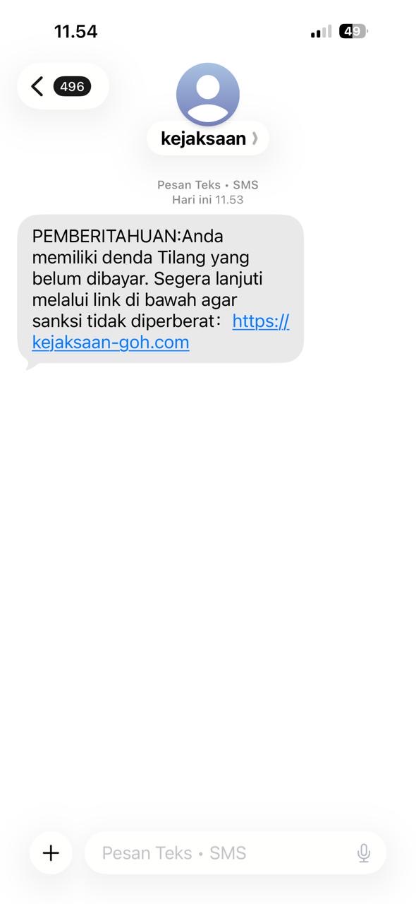 Menurutnya, SMS tersebut diawali dengan tulisan “PEMBERITAHUAN” dan nama pengirim tertulis “kejaksaan”, sehingga sekilas terlihat meyakinkan.
